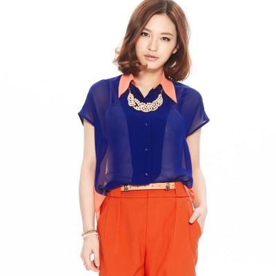 时尚撞色大翻领落肩袖雪纺衬衫 宝蓝色
