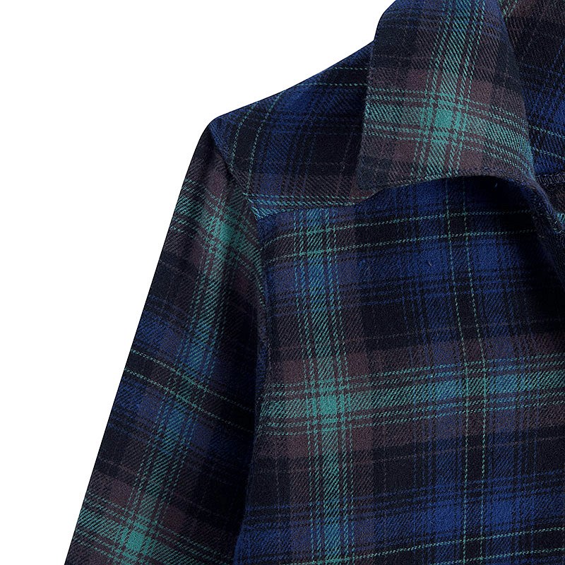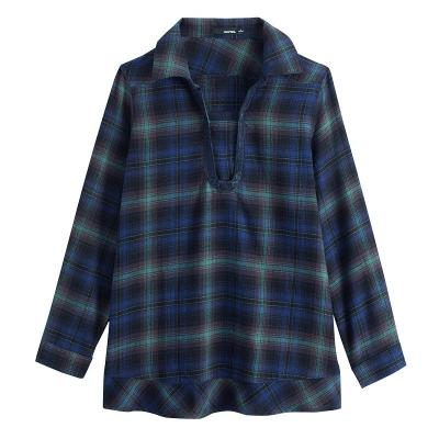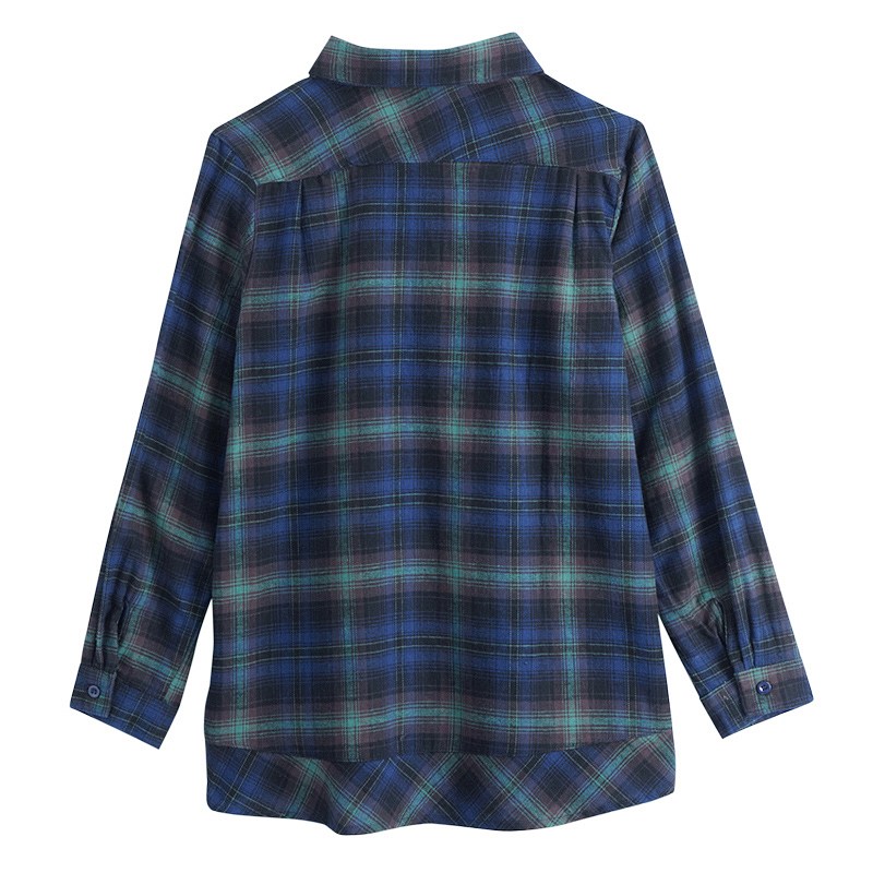 • 全棉色织格子格调拼接女式长袖衬衫 蓝绿格子